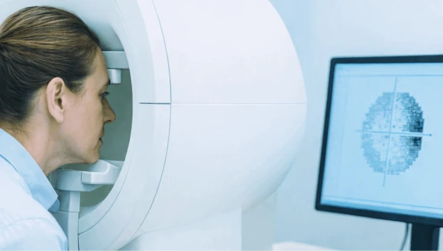 Avalia o campo de visão, identificando se há áreas em que a pessoa não enxerga adequadamente (perdas periféricas ou centrais). É indispensável no acompanhamento do glaucoma e em doenças neurológicas que afetam o nervo óptico.