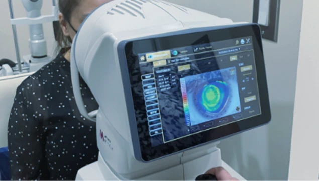 Faz um mapa tridimensional da curvatura da córnea, revelando irregularidades não perceptíveis em exames comuns. É essencial para diagnóstico e acompanhamento de ceratocone, planejamento de cirurgias refrativas e adaptação de lentes especiais.